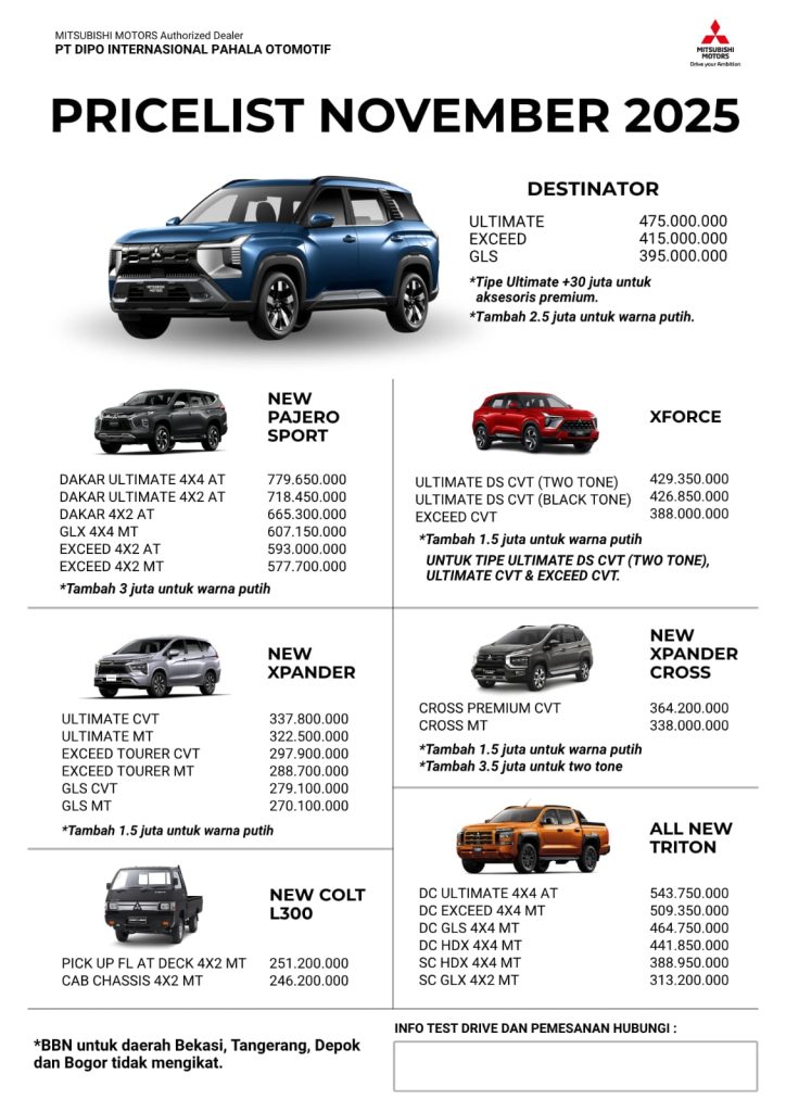 Harga On The Road (OTR) untuk wilayah Jakarta, yang mencakup kawasan Puri Indah, Kembangan, hingga Meruya dan sekitarnya, menjadi acuan utama. Perlu diperhatikan bahwa harga ini bersifat tidak mengikat dan dapat berubah sewaktu-waktu tergantung kebijakan PT Mitsubishi Motors Krama Yudha Sales Indonesia (MMKSI)