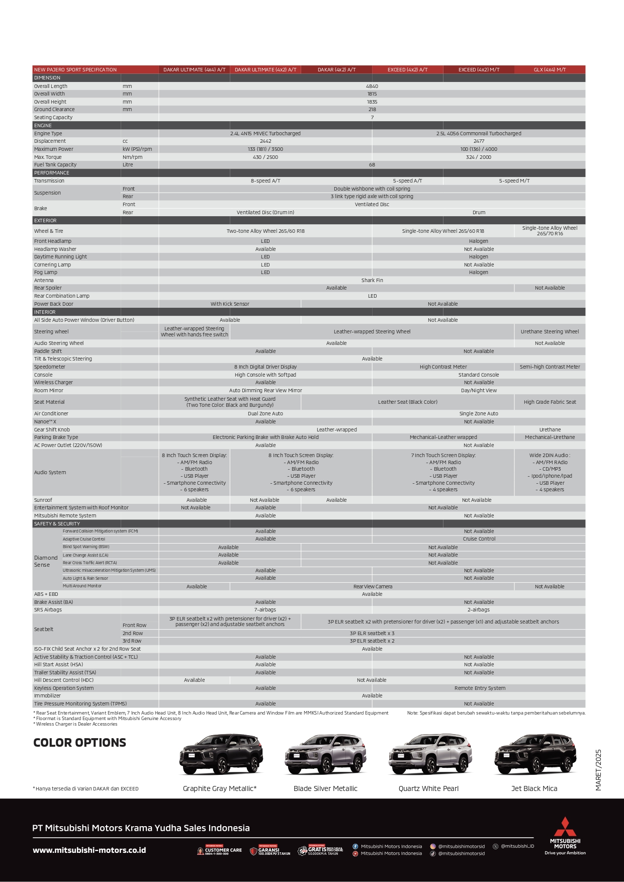 Pajero Sport menggabungkan desain yang tegas, performa mesin diesel yang tangguh, dan interior mewah yang memberikan kenyamanan maksimal bagi seluruh keluarga. Jika Anda mencari kendaraan yang dapat memenuhi kebutuhan harian Anda sekaligus menemani petualangan weekend Anda, Pajero Sport adalah pilihan yang tidak tertandingi.